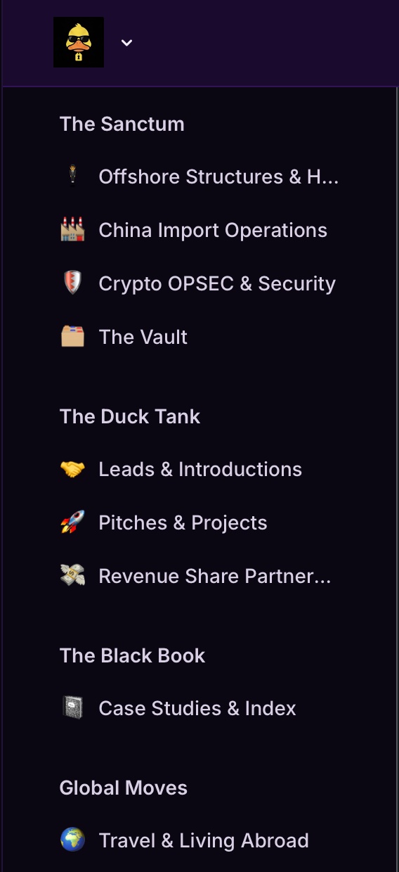 Offshore, China import, crypto OPSEC e estruturas internacionais — não como teoria, mas como execução real com proteção.
